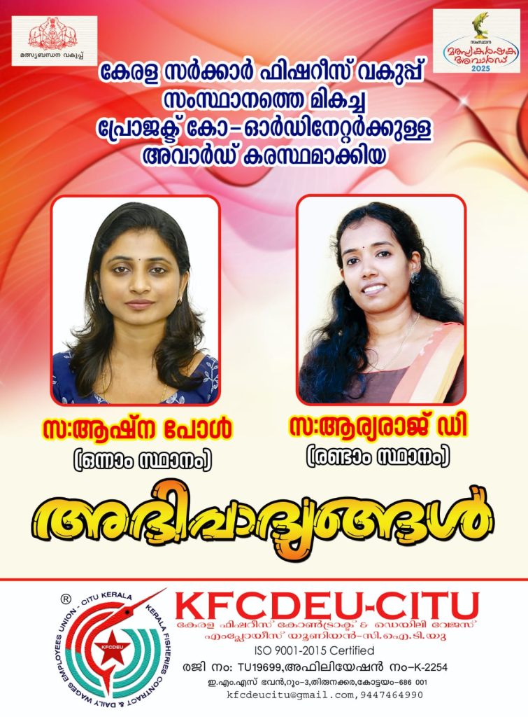 കേരള സർക്കാർ ഫിഷറീസ് വകുപ്പിലെ 2025 വർഷത്തിലെ മികച്ച പ്രോജക്ട് കോ-ഓർഡിനേറ്റർ അവാർഡ് ഒന്നാം സ്ഥാനം ലഭിച്ച സ:ആഷ്ന പോൾ ( മദ്ധ്യ മേഖല തല ട്രഷറർ – KFCDEU) രണ്ടാം സ്ഥാനം ലഭിച്ച സ:ആര്യരാജ് ഡി ( അംഗം – KFCDEU) എന്നിവർക്കും , അവാർഡ് സെലെക്ഷനിൽ പങ്കെടുത്ത എല്ലാ സഖാക്കൾക്കും KFCDEU – CITU സംസ്ഥാന കമ്മിറ്റിയുടെ ചുവപ്പൻ അഭിവാദ്യങ്ങൾ..